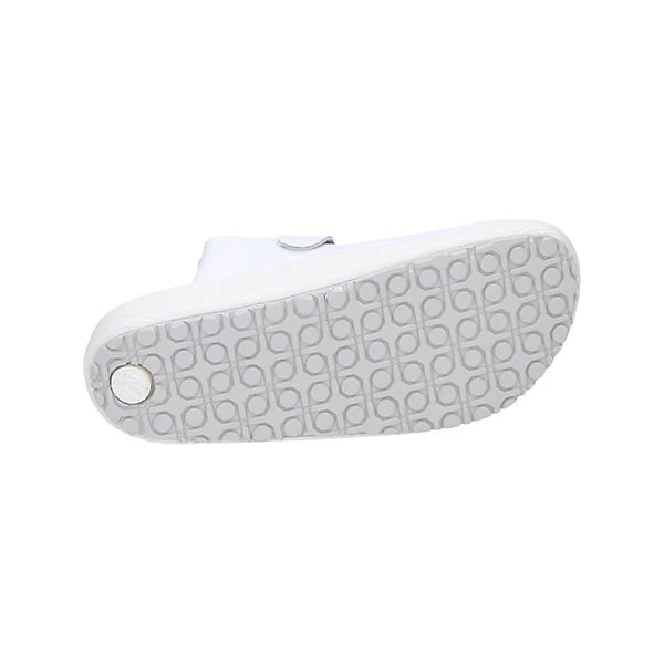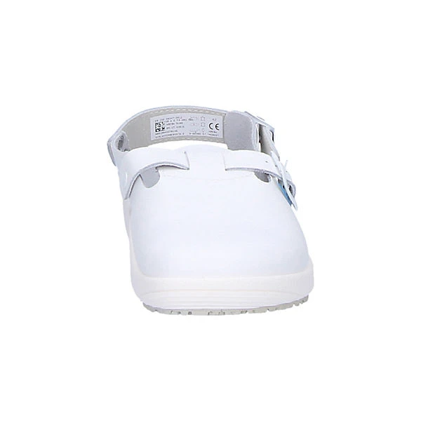 Sicherheitsklasse: EN ISO 20347:2012; OB A E FO WRU SR, Zehenschutz: ohne, Durchtrittschutz: ohne, Obermaterial: Glattleder, Farbe: weiß, Innenfutter: Leder, Sohle: rutschhemmende Gummilaufsohle, Weite: 10, Extras: feststehender Fersenriemen, verstellbarer Ristriemen, Lederdecksohle, Sanitized behandelt, beständig gegen Säuren, Laugen und Kraftstoffe, antistatisch