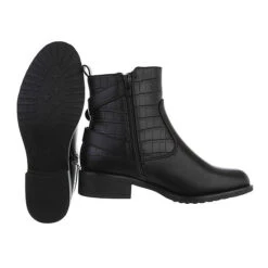 Flache Stiefeletten Reißverschluss, Blockabsatz, Riemen, Used Look – Schwarz