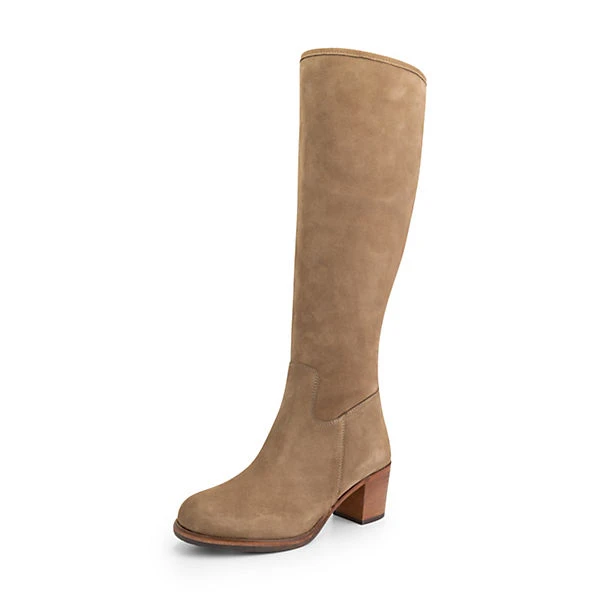 Mysa Petunia ist ein knielanger Lederstiefel mit Absatz. Der Stiefel hat einen durchgehenden Reißverschluss und ist vollständig mit Leder gefüttert. In dem Stiefel befindet sich ein herausnehmbares Fußbett aus weichem Schaumstoff mit einer Lederschicht. Die Sohle hat ein Profil für zusätzlichen Halt.