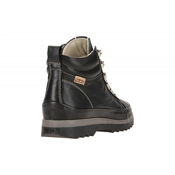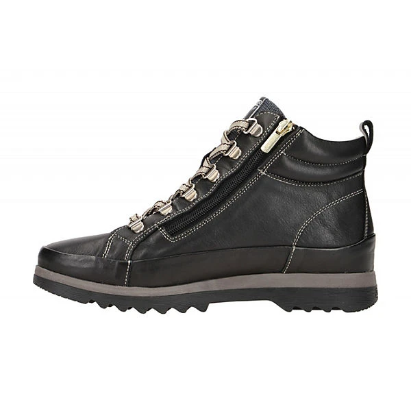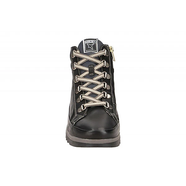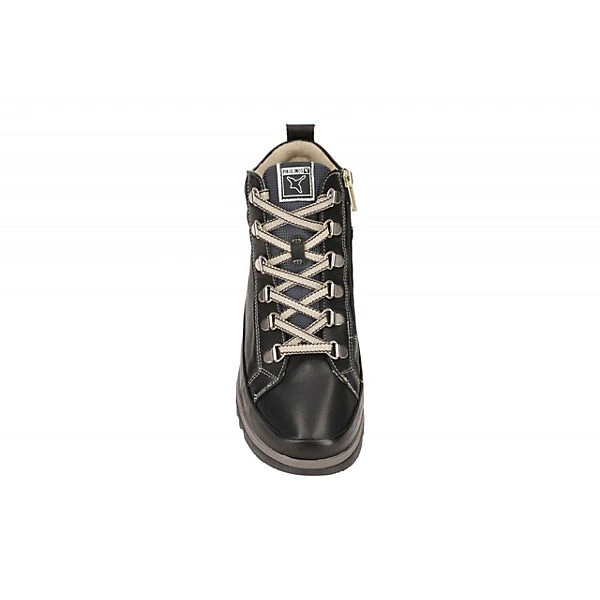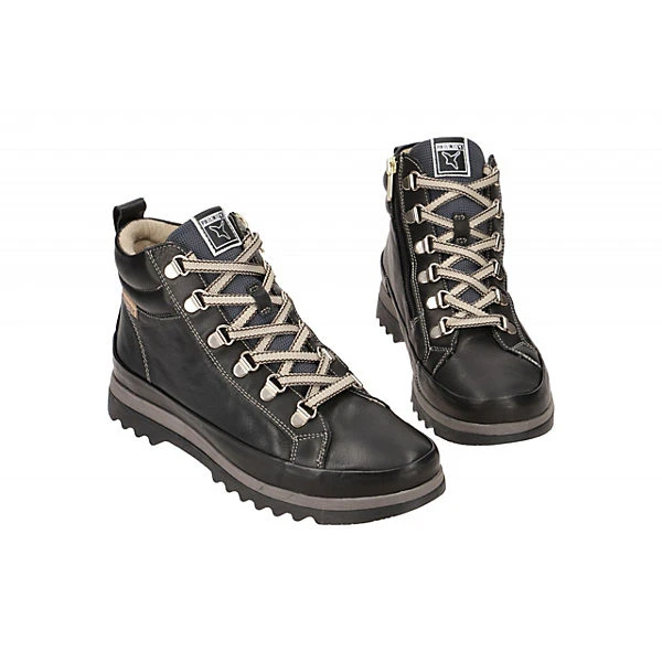 Hersteller: Pikolinos Hersteller Art-Nr.: W3W-8564 black Modellname: VIGO Machart: Damen Stiefeletten – sportliche Stiefelette, Mid-Sneakers Farbe: schwarz + grau (black) Obermaterial: Echtleder – Glattleder (Rind) Innenfutter: Textil – weich gepolstert Innensohle: Textil Fußbett Wechselfußbett: Ja – herausnehmbare Innensohle Laufsohle: Gummisohle Verschluss: Schnürung und Reißverschluss Absatzart: flach – kein Absatz Schafthöhe: Knöchelhoch, ca. 11cm Schuhform: rund Größenhinweis: fällt normal aus Weitenangabe: G – normal Weite