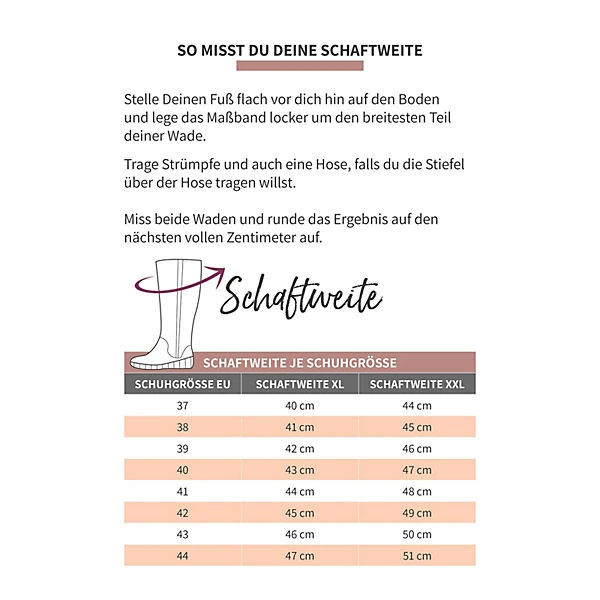 Der Weitschaftstiefel von sheego sorgt mit modischen Details wie dem mehrfach umwickelte Riemchen mit kleiner Zierschnalle für Raffinesse. Eine dekorative Krokoprägung am Riemen sowie an der Zierleiste hinten am Schaft runden den Style edel ab. Der sehr breite elastische Einsatz am hinteren Schaft sorgt für ein bequemes Tragegefühl und optimale Passform, ein Reißverschluss an der Schaftinnenseite erleichtert das Anziehen. Dank der herausnehmbaren Innensohle ist das Tragen eigener Einlagen problemlos möglich. Bei der Fußweite G handelt es sich um eine Komfortweite für breitere Füße. Die Absatzhöhe beträgt ca. 4 cm. Unsere Tipps: Bitte beachte, dass die Schaftweite bei jedem Stiefelmodell unterschiedlich ausfallen kann. Miss daher vor der Bestellung deine Wadenweite nach – eine Anleitung dazu findest du in den Produktbildern. Auch die hochwertige Lederverarbeitung sowie die weiche Haptik des Leders zeichnen das Stiefel-Paar aus. Da das Leder ein Naturprodukt ist, kann es in Farbe und Aussehen variieren. Auch kleine Unregelmäßigkeiten wie Kratzer und Narben sind ein wichtiges Merkmal für die Echtheit des Materials und stellen keinen Mangel dar. Jedes Paar ist ein Unikat. Wir empfehlen, den Style wie andere Lederartikel zu pflegen.